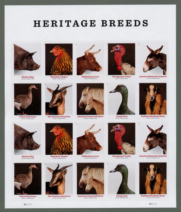 The pane of 20 stamps includes photographs of 10 heritage breeds: the Mulefoot hog, the Wyandotte chicken, the Milking Devon cow, the Narragansett turkey, the American Mammoth Jackstock donkey, (second row) the Cotton Patch goose, the San Clemente Island goat, the American Cream draft horse, the Cayuga duck and the Barbados Blackbelly sheep.