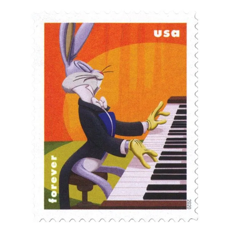 About the stamp designs: Features Bugs Bunny as a piano player, with artwork from Warner Bros. animation artists.