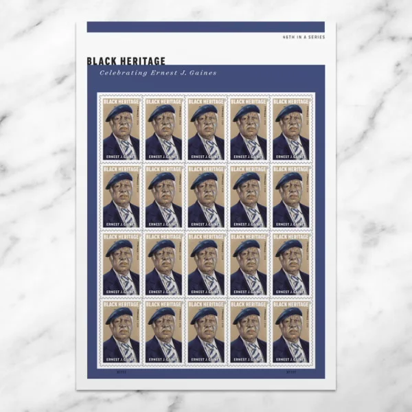 The 46th stamp in the Black Heritage series honors author Ernest J. Gaines (1933–2019). Best known for such novels as The Autobiography of Miss Jane Pittman and A Lesson Before Dying, Gaines drew from his childhood as the son of sharecroppers on a Louisiana plantation to explore the untold stories of rural African Americans.
