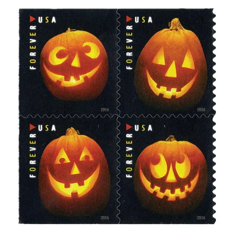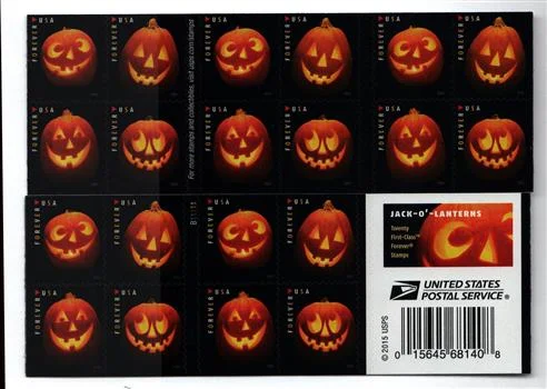 The sheet of 20 stamps features four different photographs of jack-o’-lanterns. The jack-o’-lanterns were carved by Paul Montanari and photographed by Sally Andersen-Bruce. The stamps were designed by art director Derry Noyes.